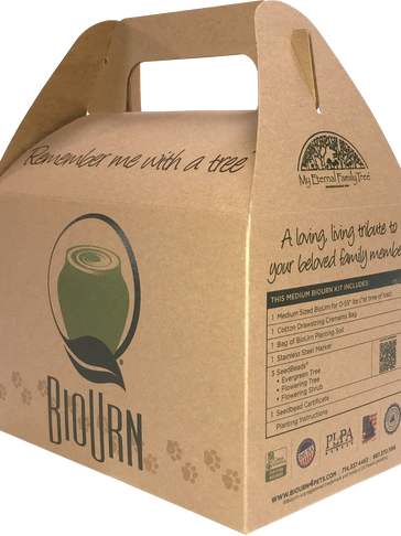 Packaging for a plantable pet cremation urn that would grow into a memorial tree